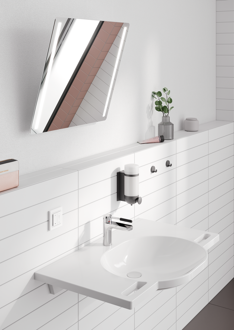 Users can easily and conveniently adjust the inclination of the motorized HEWI adjustable mirror Plus using the wireless wall switch. It is battery- and maintenance-free and, depending on its position, can be reached comfortably while standing or sitting.